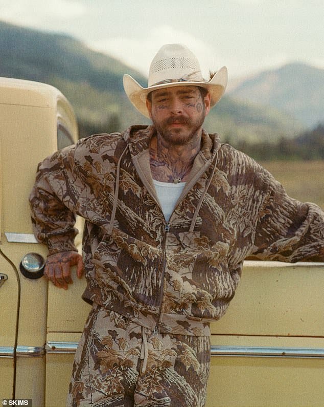 The collaboration, announced on social media Tuesday, sees Malone modeling pieces from the brand’s men’s line, including the signature SKIMS Cotton collection and the new Heavyweight Fleece in Realtree camo print. The campaign blends fashion with the great outdoors, and Malone embraced it fully, appearing shirtless in camo briefs and a white cowboy hat while performing everyday ranch tasks like gathering firewood.